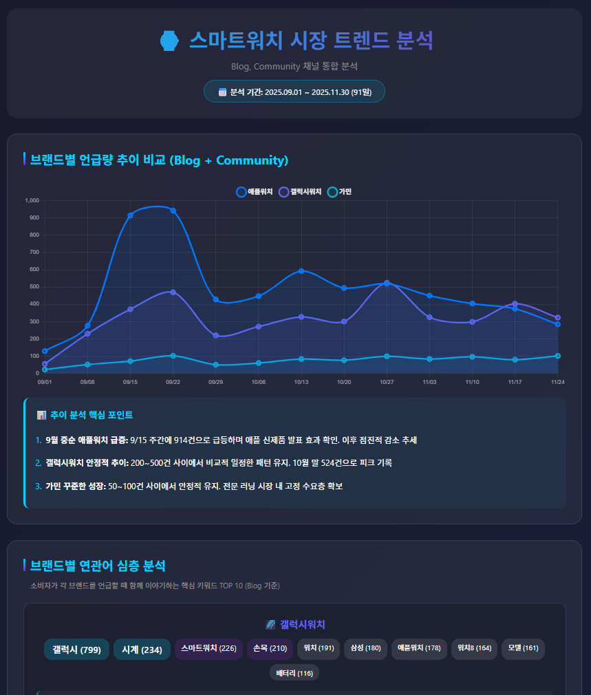 ✅ 신제품 시즌에 커뮤니티를 장악하는 '애플'과 전문 운동 키워드로 시장 점유율을 높이고 있는 '가민'의 소비자 커뮤니케이션 전략이 핵심 포인트