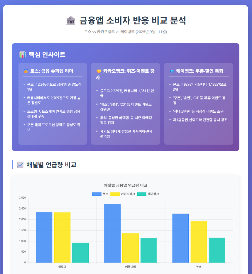 ✅ '토스'의 플랫폼 편의성, '카카오뱅크'의 퀴즈/이벤트 접근성, '케이뱅크'의 직접적 리워드(최대 5만원 등)가 3사 이용 고객을 가르는 핵심 키워드