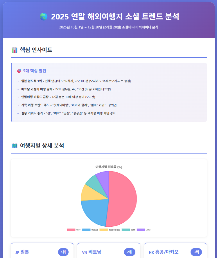 ✅ 사람들이 많이 찾는 해외여행지로 '일본'의 압도적 점유율(52%)과 따뜻한 날씨의 가성비 여행지 '베트남'과 '유럽 크리스마스 마켓'의 수요가 특징적으로 나타남